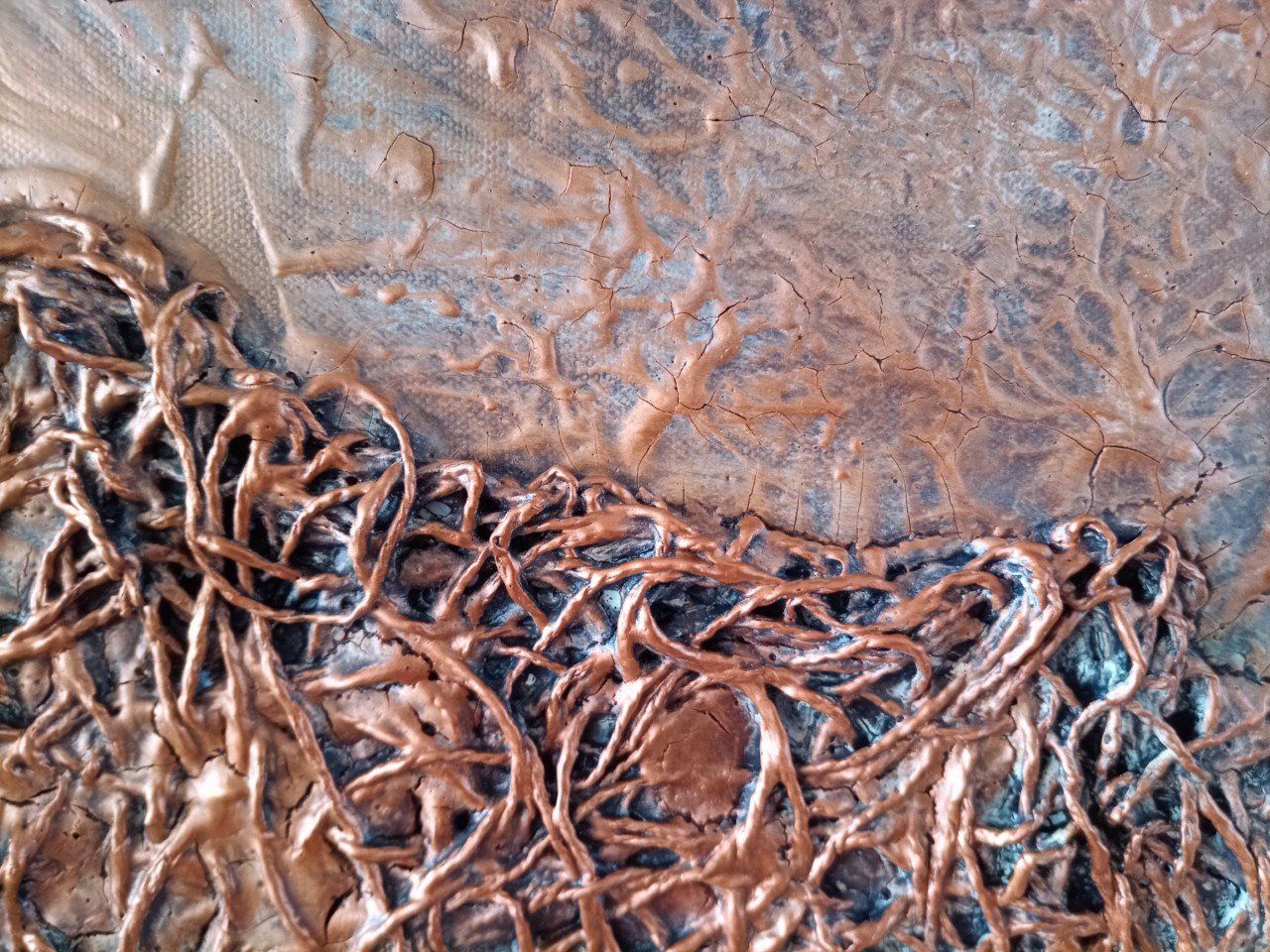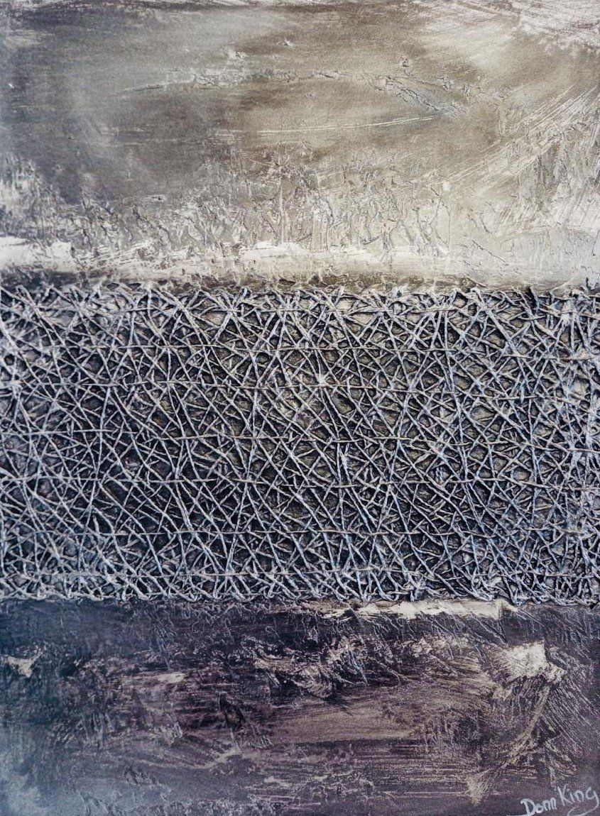Seine Techniken erzeugen interessante Textur-Effekte durch die Anwendung verschiedener Materialien.